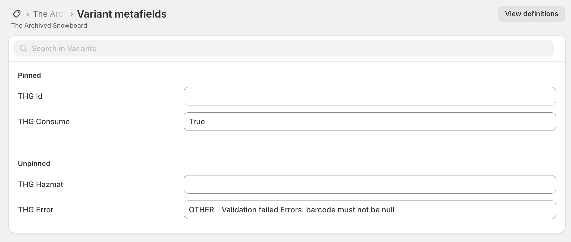 thg.consume: Boolean field to enable/disable product consumption (editable)thg.hazmat: Boolean field for hazardous materials classification (editable)thg.errors: Displays any issues with product consumption (read-only)thg.id: Stores the THG product ID for reference (read-only)