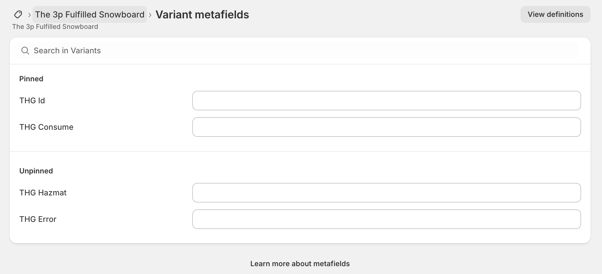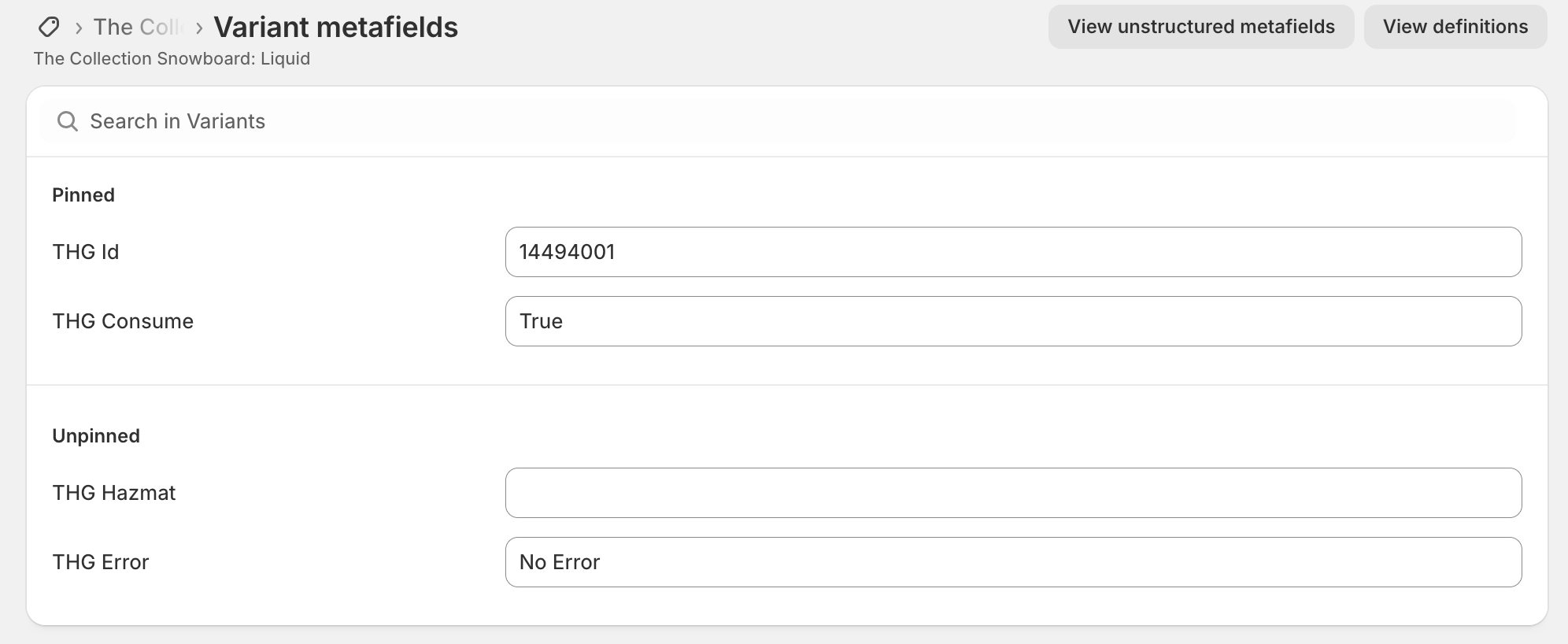 During onboarding, THG Connect creates the following metafields on your ProductVariants: